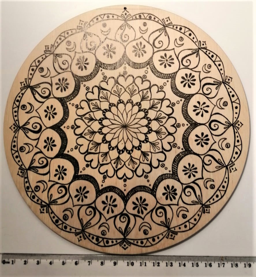 3 mm vastag rétegelt nyírfa lemezre nyomtatott mandala, mely színezhető, pontozható, vagy akár natúran is gyönyörű dísze lehet lakásodnak.
