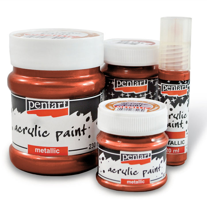 Nagy pigmenttartalmú, fényesen csillogó festék, mellyel tökéletes fedés érhető el.  Vizes bázisú, gyorsan száradó, jól fedő szagtalan akrilfesték, amely metál bevonatot képez, s egy rétegben felkenve is tartósan, egyenletesen fed. Felhasználható: papír, fa, agyag, gipsz, hungarocell, vászon stb. felületekre. 30 perces száradás után már nem oldódik vízben. Használat előtt jól keverjük fel.Vízzel hígítható. Kiszerelés: 20 ml Alkalmas pontmandala készítésére is.