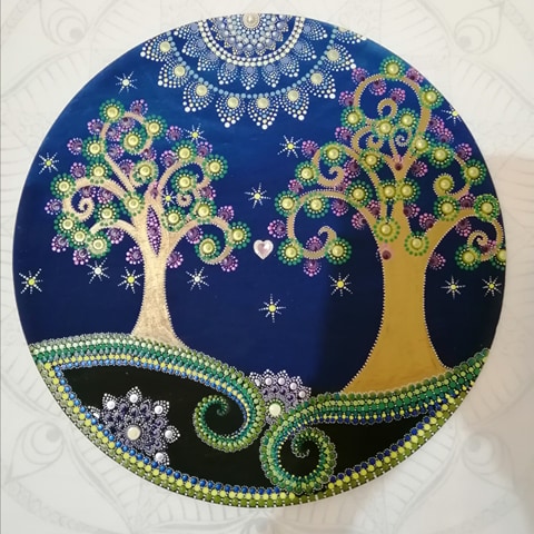 40 cm átmérőjű rétegelt nyírfa lemezre készült a Páros Életfa festmény. Tetején lyuk található, melynek segítségével könnyedén falra akasztható.