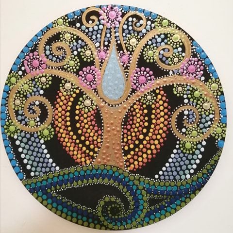 20 cm átmérőjű kör alapra készült ez az egyedi  saját tervezésű pontfestett Életfa. 3 mm vastag rétegelt nyírfa lemezre festettem.  A kép tetején lévő lyuk miatt könnyen falra rögzíthető.