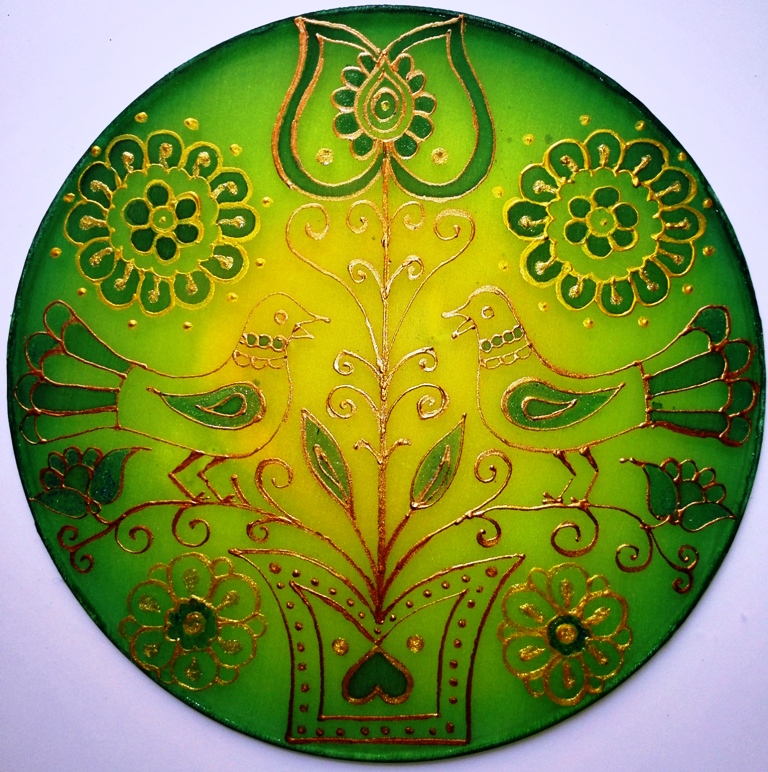 20 cm-es hernyóselyem pongéra kézzel festett motívum. A Selyemkép falra vagy ablak elé helyezhető. Damilra vagy cérnára is fúzhető, de fel is lehet akasztani a pereménél. Rendelhető nagyobb méretetben (25 cm, 35 cm) és más színekben is. Elkészülési idő: 2-3 nap.